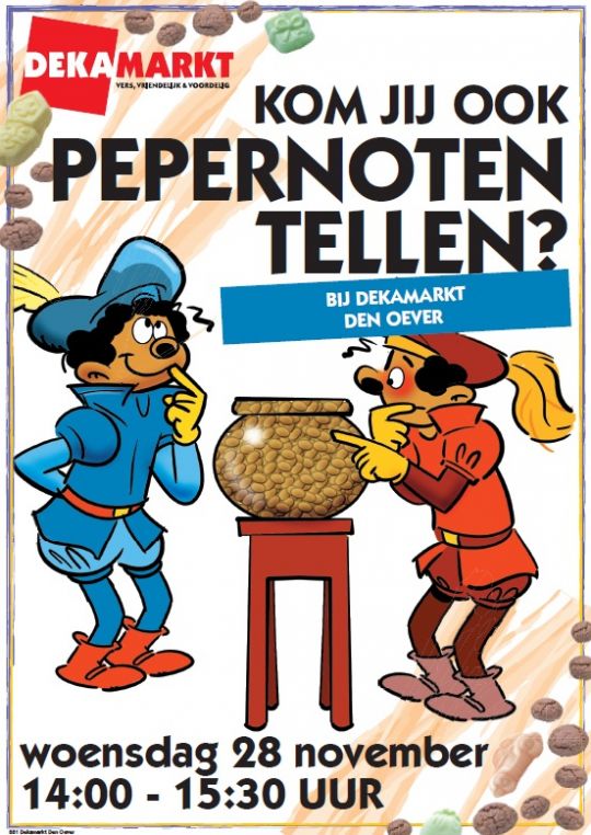 Op 28 november van 14:00 tot 15:30 uur geeft Dekamarkt Den Oever een geweldig Sint- feest! Kleine kinderen tot 9 jaar kunnen dan deelnemen aan een aantal leuke activiteiten zoals; Taaihappen, Boekenlopen en Pepernoten raden. Met deze activiteiten kunnen de kinderen dan toffe prijzen winnen. Deze prijzen worden dan door Sint en Piet uitgereikt op 1 december van 12:30 tot 13.30 uur.